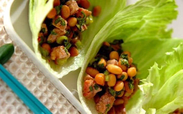 豚肉、小松菜、水煮大豆の甘辛おかずをレタスに包んでいただきます。あっさりとしていて、いくらでも食べられそうです。ちょっとしたパーティー気分を楽しめ、野菜もたっぷり摂れて一石二鳥です。