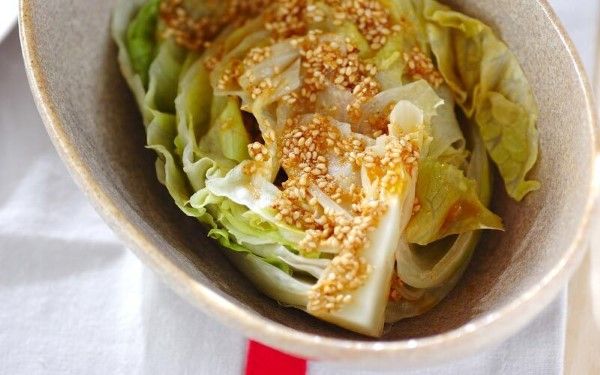 豪快に1人分1/4のレタスを使用。レンジでチンしたら、合わせゴマポン酢をかけて召し上がれ。レタスの甘みが引き出され、芯までペロリと食べられます。簡単すぎてこれはリピ確定!