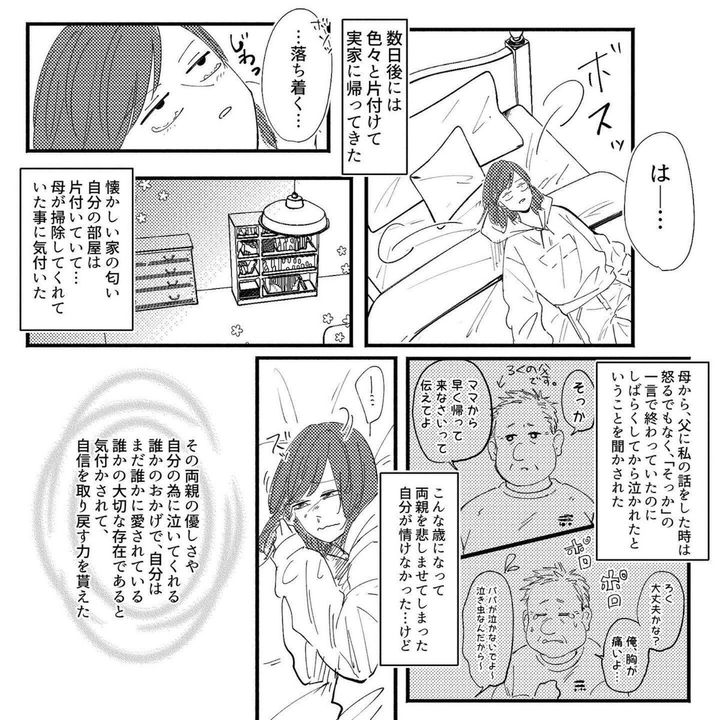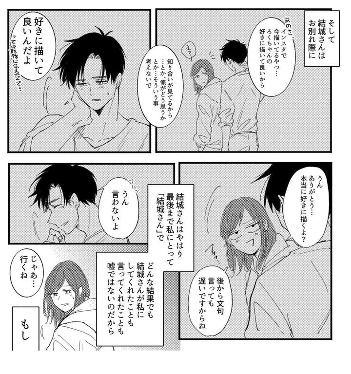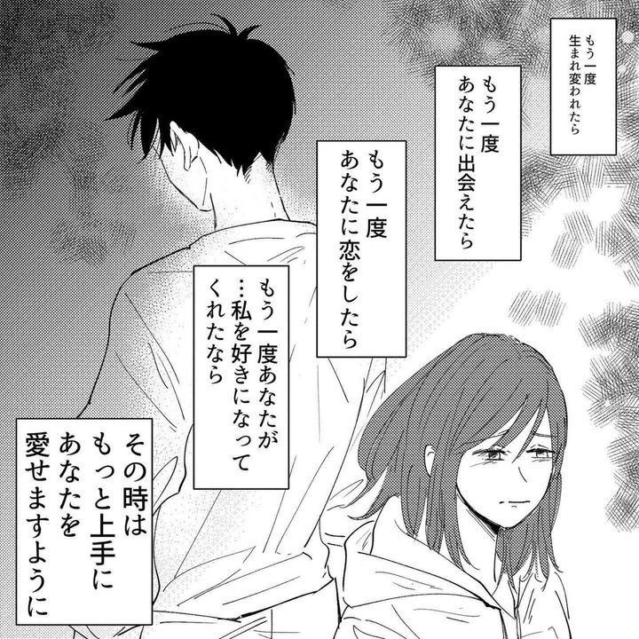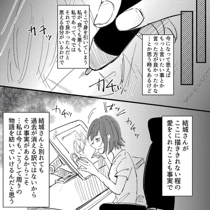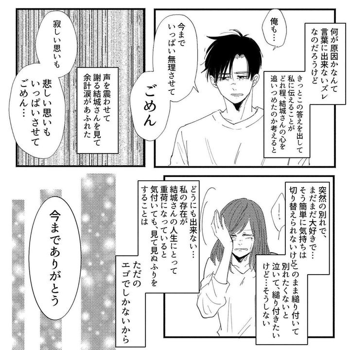 この漫画は、プロポーズをへて、結婚に向かっていくはずだったろく(@dndn.mushi)さんと恋人が、価値観や気持ちのすれ違いから揺れ動き、お別れを選ぶまでのエピソードが描かれています。小さなズレが積み重なり、二度と交わることがなくなった2人。あふれて止まらない涙と共に、ろくさんは結城さんへ精いっぱいの言葉を送ります。ろくさんにとっての結城さんは忘れられない人になったようです。『もう一度』最終話をごらんください。