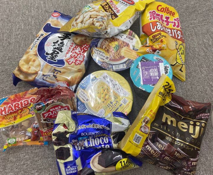 中身を出したらこんな感じ。たくさん入っています。計10点。カップ麺やスナック菓子も最近は値上げしているので一個100円以上で売られていますし、ファミリーパックのお菓子だと200円以上しますよね。となるとざっと計算しても1500円以上の内容量です。それが1080円で買えたのはラッキーでした。