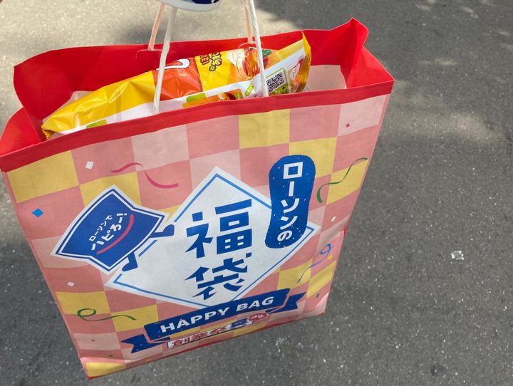 もう一つ創業祭でたのしみにしていたのが「ローソン創業祭福袋」(税込み1080円)です。袋のデザインがカラフルでかわいい♪大きな袋に食品がパンパンに入っています。