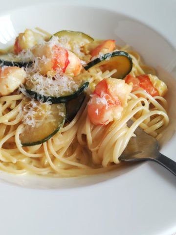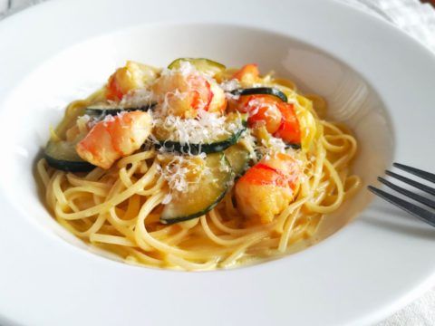 *子どものごはんに白ワインはちょっと…という人は、水でも大丈夫です(エビの臭みを取り、風味がよくなるよう白ワインを加えています)