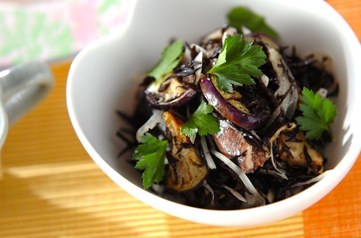 炒めたナスと水で戻した芽ヒジキを使う、ユニークなマリネです。野菜と海藻だけでは淡泊になりがちなマリネに、オイルサーディンを混ぜ合わせることでコクが増しますよ。オイルサーディンはあまり崩さず、あえて大きめにすると存在感がアップ。