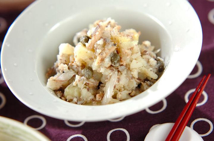 おつまみに人気のポテトサラダに、オイルサーディンをプラス。オイルサーディンはイワシ特有のにおいがあるため、軽く炒めてから合わせましょう。レモン汁の爽やかな香りと酸味で、リッチなポテトサラダに仕上がりますよ。