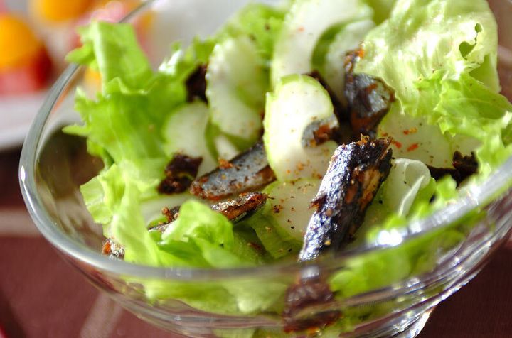 レタスとセロリのサラダに炒めたオイルサーディンを油ごとかけると、ドレッシング代わりに。オイルサーディンの強い旨みが新鮮野菜と好相性です。水菜やパプリカの風味もアクセント。オイルサーディンは弱火で炒め、カリカリにしましょう。