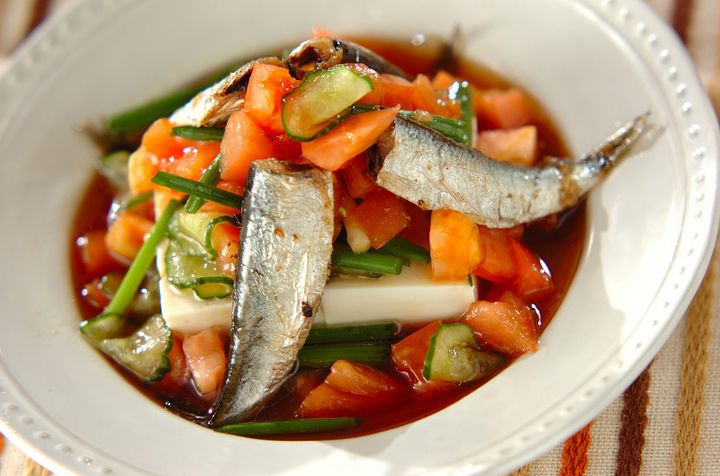 キュウリとトマトの豆腐サラダに、アツアツのオイルサーディンをのせるとひと味違うおつまみになりますよ。オイルサーディンはしっかり温まるまで加熱するのがポイント。缶の油もかけることで、旨みを存分に味わえます。