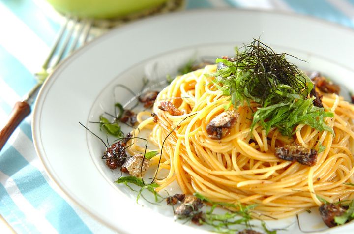 佃煮や大葉などの和素材にオイルサーディンを組みわせる和洋折衷のパスタです。キノコをたっぷり使うので、満足感が得られるのも魅力。オイルサーディンの油も余さず活用し、パスタ全体に旨みを行き渡らせましょう。