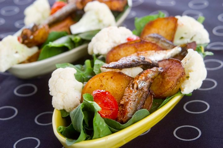 ジャガイモとカリフラワーをレンジで加熱したら、オイルサーディンを炒めたフライパンに加えます。オイルサーディンの旨みが全体に行き渡り、よりおいしさがアップ。しょうゆや一味唐辛子で味付けするため、パンだけでなくごはんにも合います。