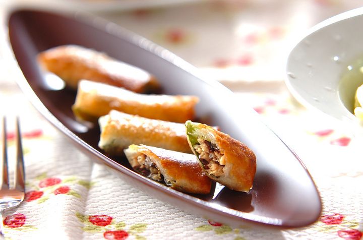 大葉とオイルサーディンを包んだ春巻きは、風味豊かな味わい。オイルサーディンの旨みで、調味料不要でも満足できるおつまみです。とろけるチーズを一緒に巻いてもおいしいですよ。