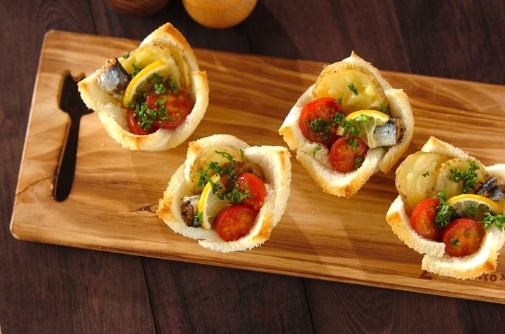 食パンをカップに見立てたおつまみは、おしゃれでパーティーにぴったり。ジャガイモとプチトマト、オイルサーディンそれぞれの風味が口いっぱいに広がる、贅沢な一品です。