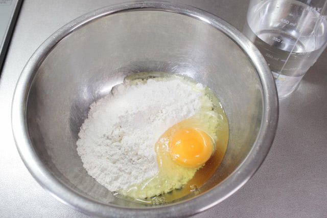 1.  たこ焼き粉、卵、水を混ぜて生地を作ります。