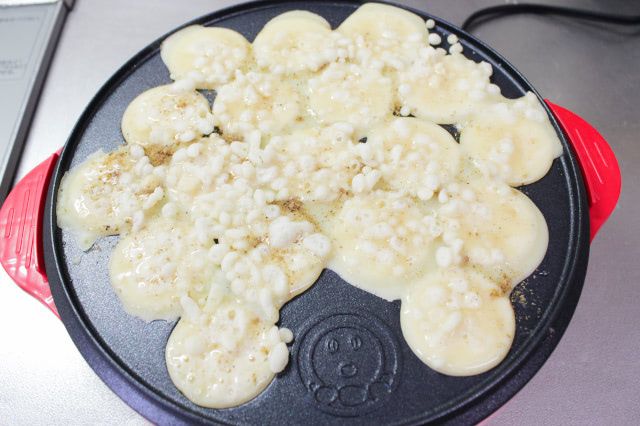 2.  油を引いたたこ焼き器に生地を流し入れ、粉かつおと天かすを全面にのせます。