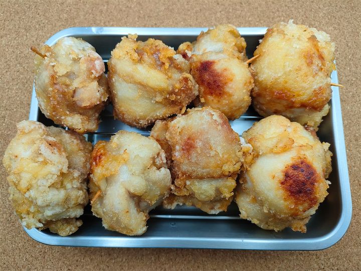 唐揚げは高温で揚げるため、どうしても水分が失われます。その失われる分の水分をあらかじめ補うことができ、しかも柔らかくなりますので硬い素材にも応用できます。かじってみるとわかりますが、衣はカリっとしているのに、中の肉は柔らかくて本当にジューシー。皮で身を包むというのは、理に適ったすばらしい発想です。また家庭でこの大きさの唐揚げを作るのは難しいと思われがちですが、この方法ならちゃんと中まで火が入りますので大丈夫です。