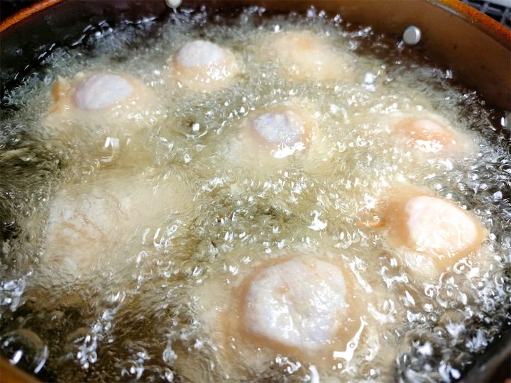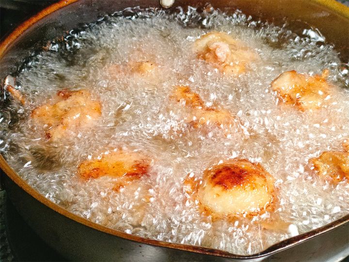 7.  油を160℃に熱して肉を入れ、4~5分ほど揚げて7割ほど火を通します。
