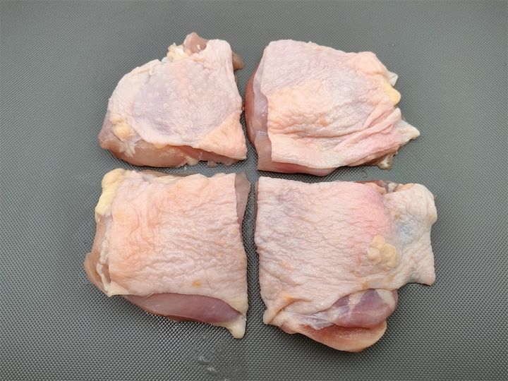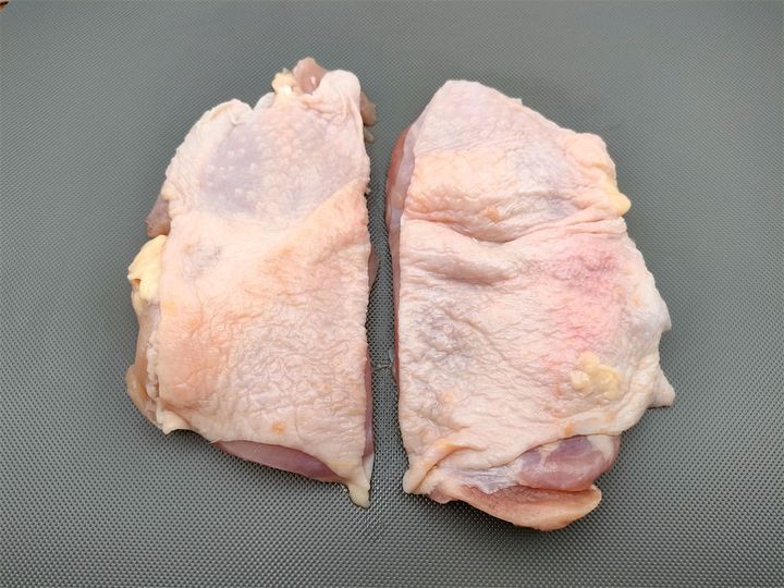 1.  鶏肉の皮をよく伸ばして、真ん中で切って二つにします。
