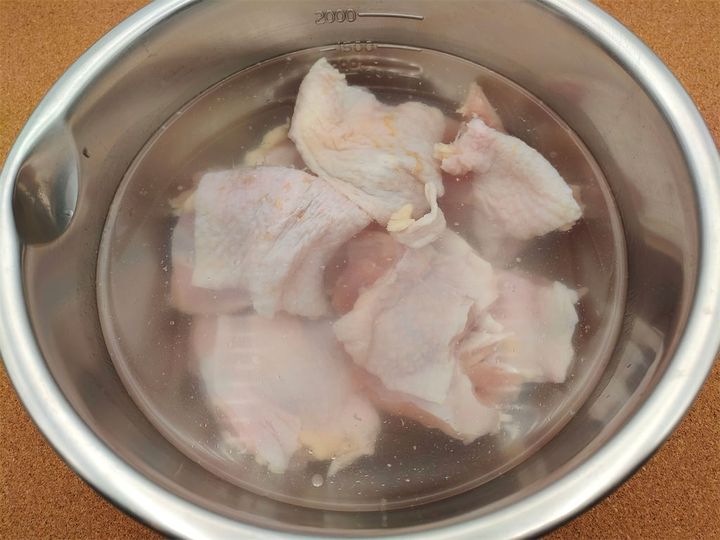 3.  作っておいた塩水に鶏肉を漬け、ラップして30分おきます。