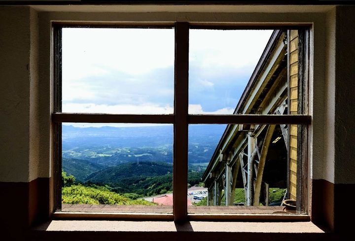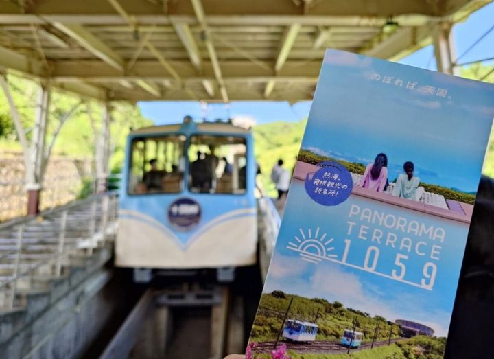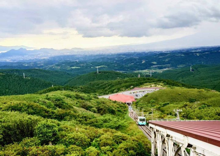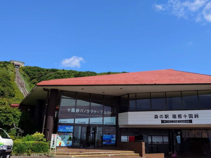 箱根関所跡港からバスで山道を登ること約25分、絶景の名所「箱根十国峠」に到着。標高666m地点にある「森の駅 箱根十国峠」内の「十国峠 山頂駅」から十国峠ケーブルカーに乗って、左上にちょこんと見える山頂展望デッキを目指します!