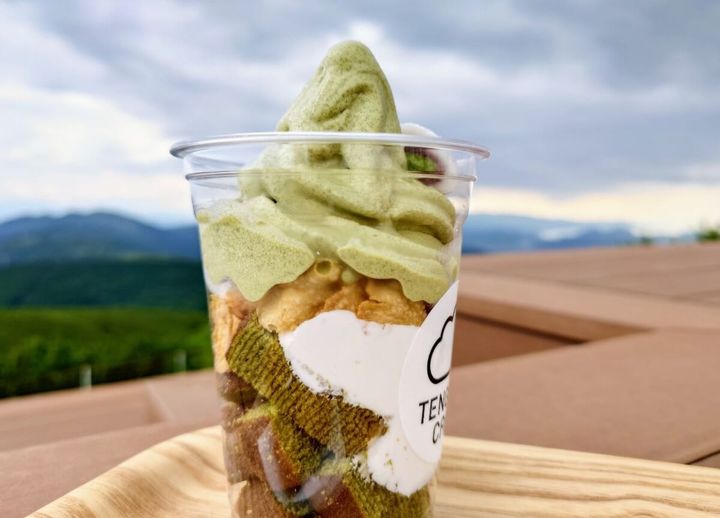 こちらは甘党さんに教えたい「TENGOKU抹茶パフェ」(税込800円)。ソフトクリームと同じ、天空抹茶のソフトクリームをこんもり盛って、餅・こし餡・抹茶を包み込んだクリーム大福「毬福」半カットをトッピングしています。
