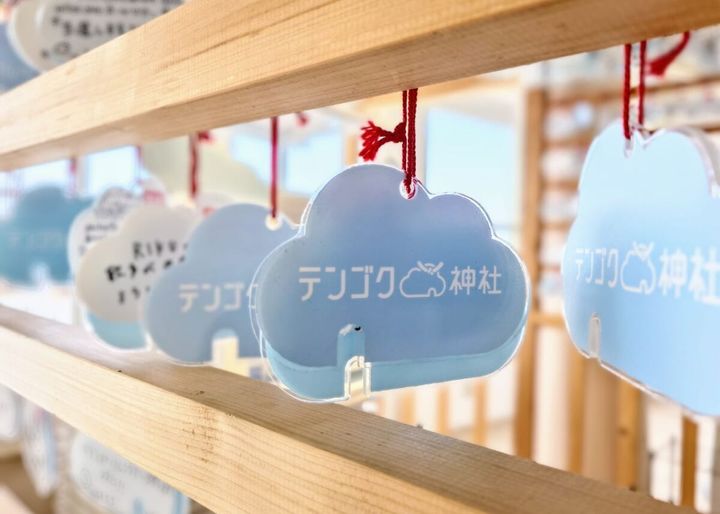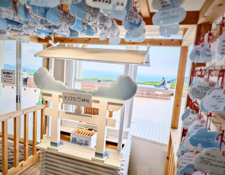 ちなみに、カフェの隣には「テンゴク神社」も祀られています。「十国峠」は「天国峠」とも言われ、雲が開けてゆく様子「開雲」を「開運」の象徴とし、雲形の絵馬が取り囲んでいます。