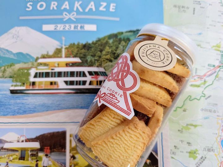 船内限定パッケージの「フジヤマクッキー ミニ」(税込850円)は、赤い水引が可愛らしくてプラストップカップなので持ち帰りも安全。