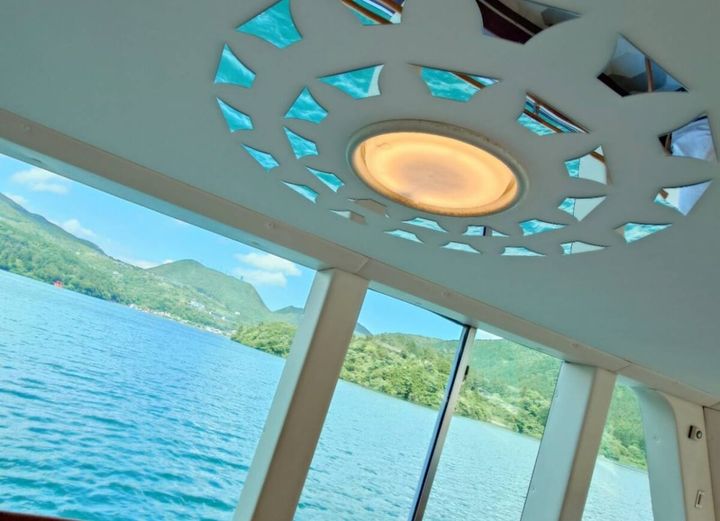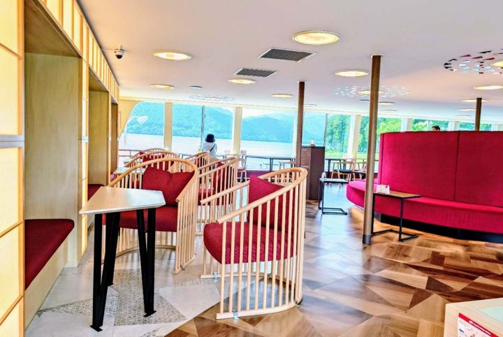 ピカピカの「SORAKAZE」。家族連れにも喜んでもらえるようにと「湖に浮かぶ緑の公園」がコンセプト。観光高速船や鉄道デザインを手掛け、MBS「情熱大陸」にも出演された川西康之さんが日本文化や地域性を取り入れてデザインされています。