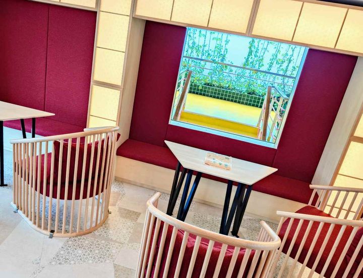 2階は、窓辺のカウンター席、赤富士をイメージしたソファ席、ゆりかごのようなハンギングチェアなど色んな席があります。