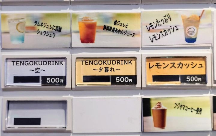 空をイメージする「TENGOKU DRINK」(税込500円)は、ラムネジュレと炭酸をあわせた「空」と、桃ジュレに静岡県産みかんジュースを合わせた「夕暮れ」の2種類。