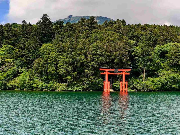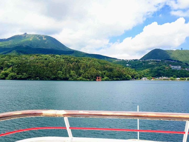 箱根関所跡港を出発して約6分、写真では小さいですが、左上の山頂には駒ヶ岳、目の前には平和の鳥居、右側には元箱根というパノラマ絶景!