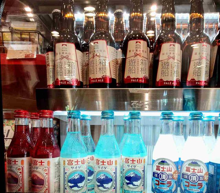 (上)船内限定「箱根遊船オリジナルクラフトビール」(税込1,000円)や、富士山マークのサイダーやコーラ、富士山ブレンドのコーヒーやカフェラテなどドリンクも(税込200円〜)。