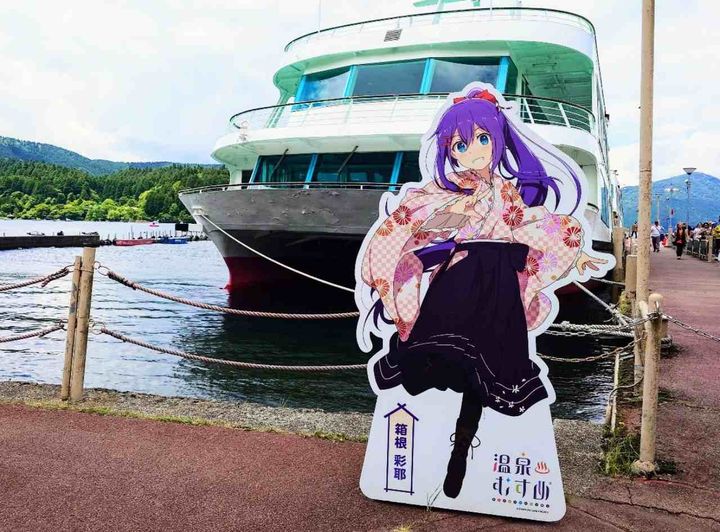 今回は「箱根関所跡港」から「周遊コース」で出発。箱根・芦ノ湖は、アニメ『弱虫ペダル』や『風が強く吹いている』の聖地巡礼の地でもありますが、港には、日本各地の温泉をモチーフにした地域活性化プロジェクト「温泉むすめ」のパネルがあったので記念にパチリと撮影。
