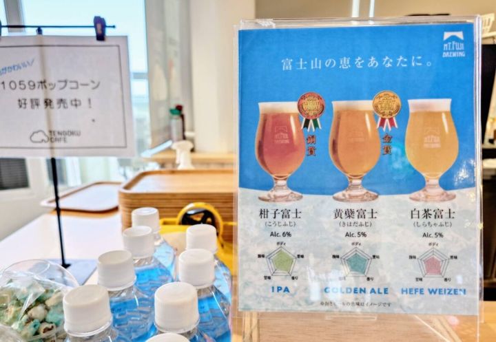 富士山の湧水から生まれた「クラフトビール(3種)」(各税込800円)はカップに注いでご提供。お酒に強ければ飲み比べもいいですね。