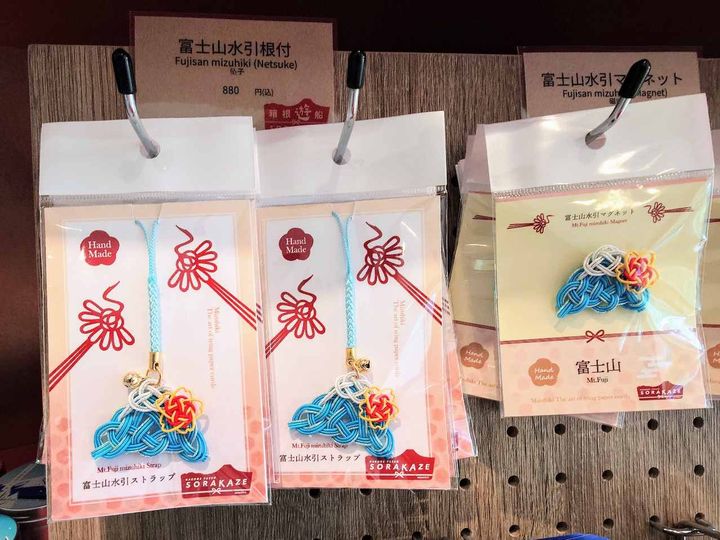 (左)「富士山水引ストラップ」(右)「富士山水引マグネット」(各税込880円)の綺麗な和小物は御利益もありそう。