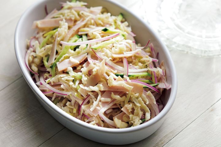 (1)切り干し大根は水で洗い、ひたひたのぬるま湯に10分ほど浸してもどす。水けをしっかり絞り、長さ2~3cmに切る。ロースハムは半分に切って、幅6~7mmに切る。紫玉ねぎは縦に薄切りにする。きゅうりは斜め薄切りにしてから細切りにする。