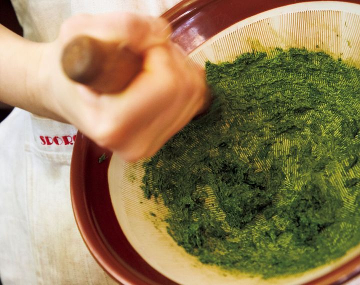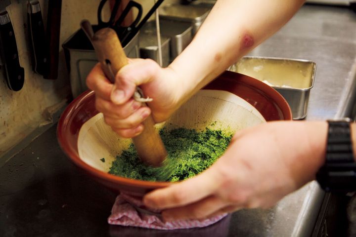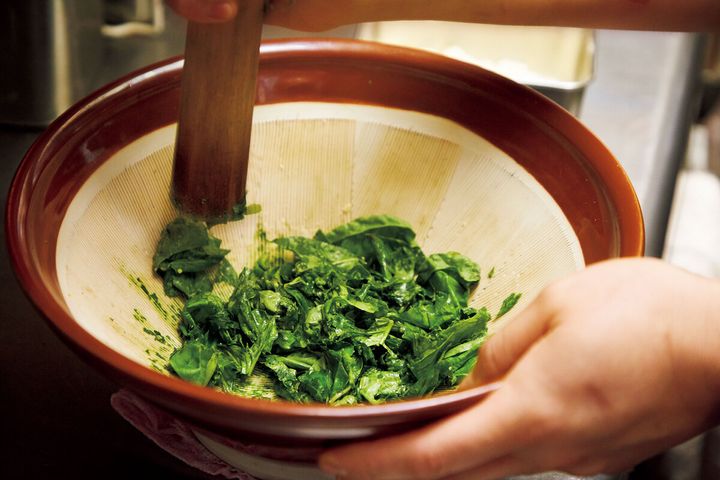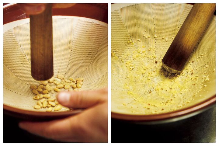 ひとたびパフォーマンスが始まれば、バジル独特の青いフレッシュな香りが店内に広がり、注文する人が続出すると評判です。そんな看板メニュー自慢のレシピを、オーナーシェフ・井上雄一さんに教えてもらいました! 特別な道具は使わず、どこの家庭にもあるすり鉢があればいいのだとか。