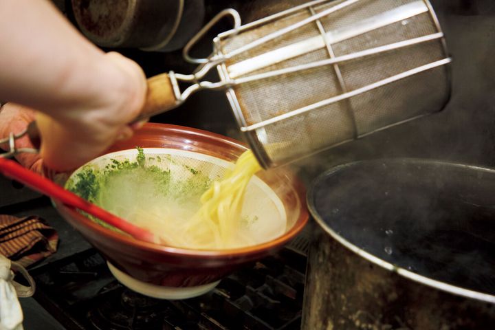 (8) ゆで上がったパスタを加える。
