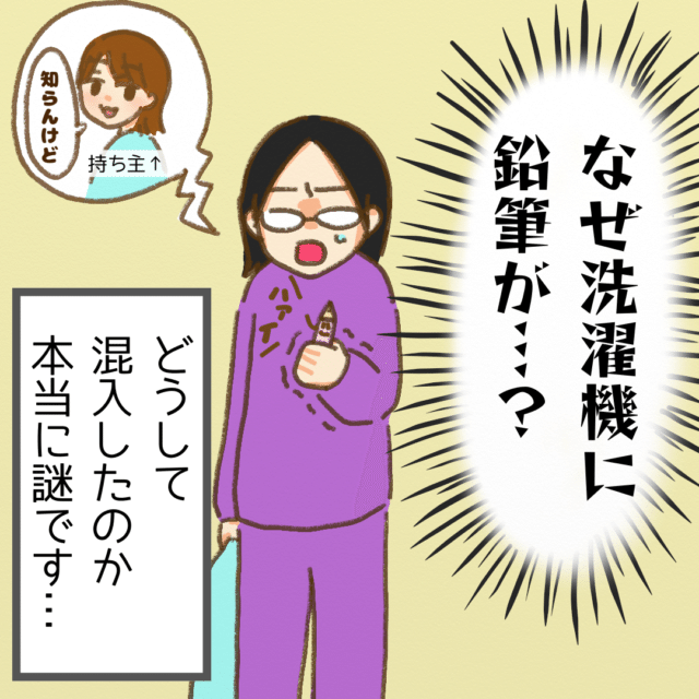 え、鉛筆!?謎ですね・・・ポケットに入っていたとしても、なぜ鉛筆をポケットに入れたのかという謎が・・・。我が家の洗濯機からは、息子が授業中に作っていたであろう練り消しが出てきましたよ~(笑)