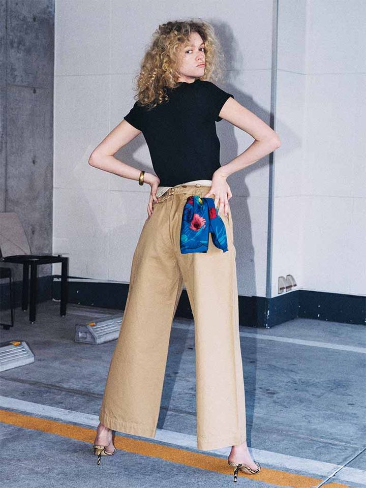 フロントのボタンをはずして、はき口を外側にひと折り。ウエストにポイントがつき、高い腰位置をマーク。ヒップのシンチバックル&ポケットに入れたスカーフで、めざすは「後ろ姿まで行き届いた人」。結果、腰まわりに立体感が生まれるから、トップスはそっけないミニマルなものでも十分もつ。