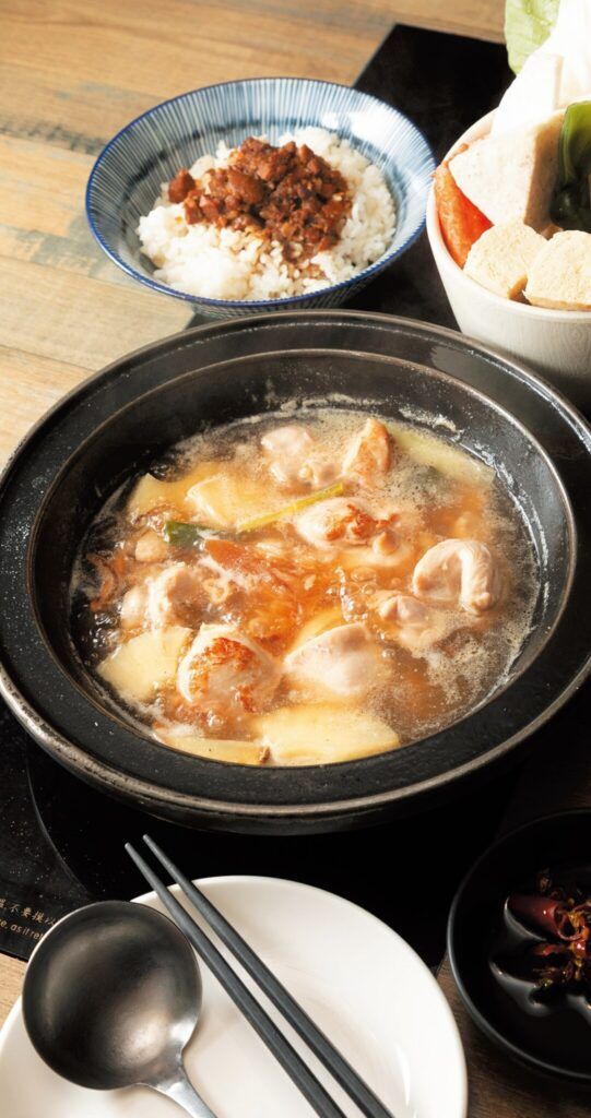 中華料理のシェフが兄弟で開業。台湾料理と鍋の融合に思いを巡らせていた際、母親が約30年前の石頭鍋ブームを懐かしんでいる様子に着想を得て、オリジナリティある石頭鍋=爆炒シリーズを考案。パイン、苦瓜、鶏肉で作る台湾の家常菜のスープをアレンジした「旺來金鶏鍋」388元はその象徴。煮干しと香味野菜を香油で炒め、パインと鶏肉、米酒とダシを加えたらスープの完成。あとは制限時間いっぱい、食べ放題の野菜などを心ゆくまで。ほっとする味わいのスープは飲み干したくなるおいしさ。TEL:02・2371・5580 11:00~21:30 無休 カード可、日本語メニューなし、サービス料10%。