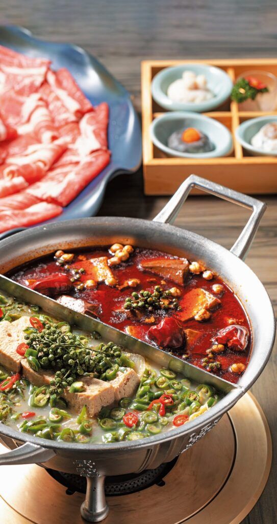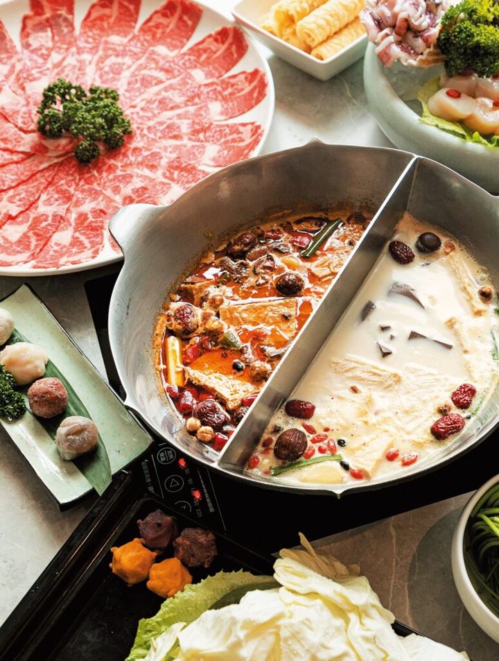“桃源郷に構える鍋専門店”をコンセプトに、ヘルシーな火鍋を提供。鶏ガラや豚骨、香味野菜をベースに、数十種の漢方スパイスを効かせた「麺包豆腐白湯鍋」、大豆やナッツを加えた練り物“アイスクリーム豆腐”をプラスする「冰淇淋豆腐鍋」、段階を踏んで炒めた漢方スパイスの香りが主役の「無老辣香鍋」の3種のスープから1種または2種の鴛鴦鍋でいただく。白いスープはこってりとコクがあり、赤いスープは香ばしく刺激的。共に奥行きのある味わい。写真の具材は無骨牛小排1098元、綜合青菜盤208元など。信義店限定の揚げ餅・流沙白糖※(米+果)も要チェック。TEL:02・2722・0316 11:30~翌1:00 無休 カード可、日本語メニューあり、サービス料10%。