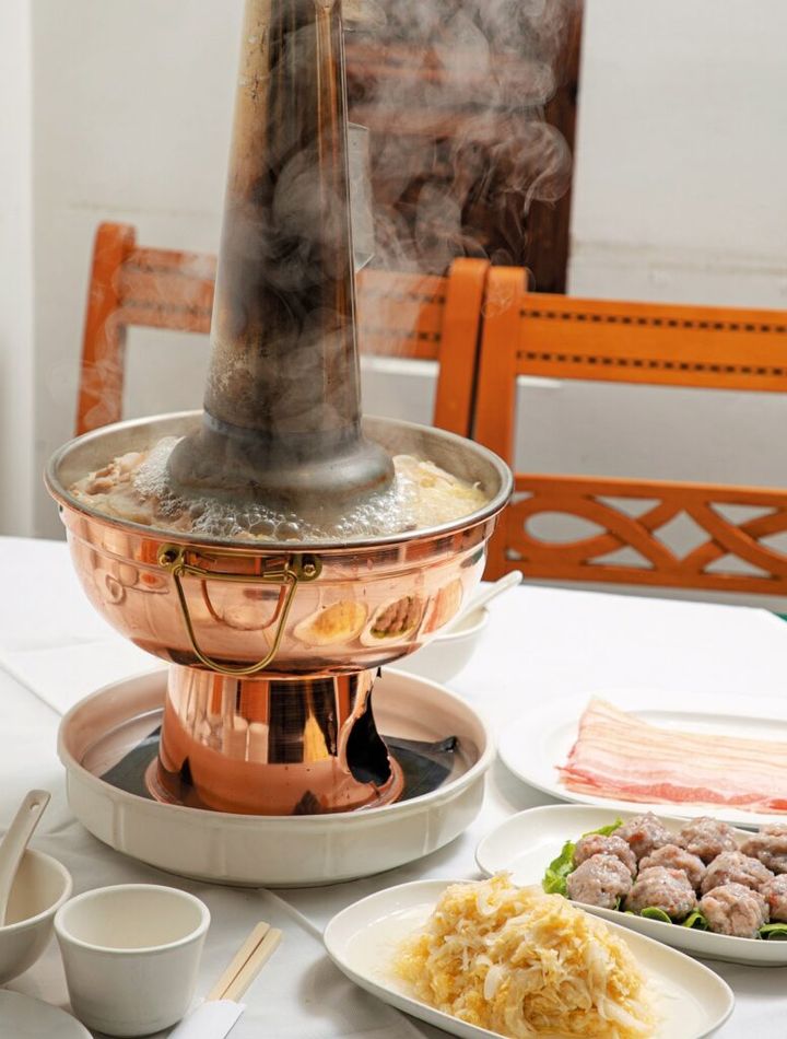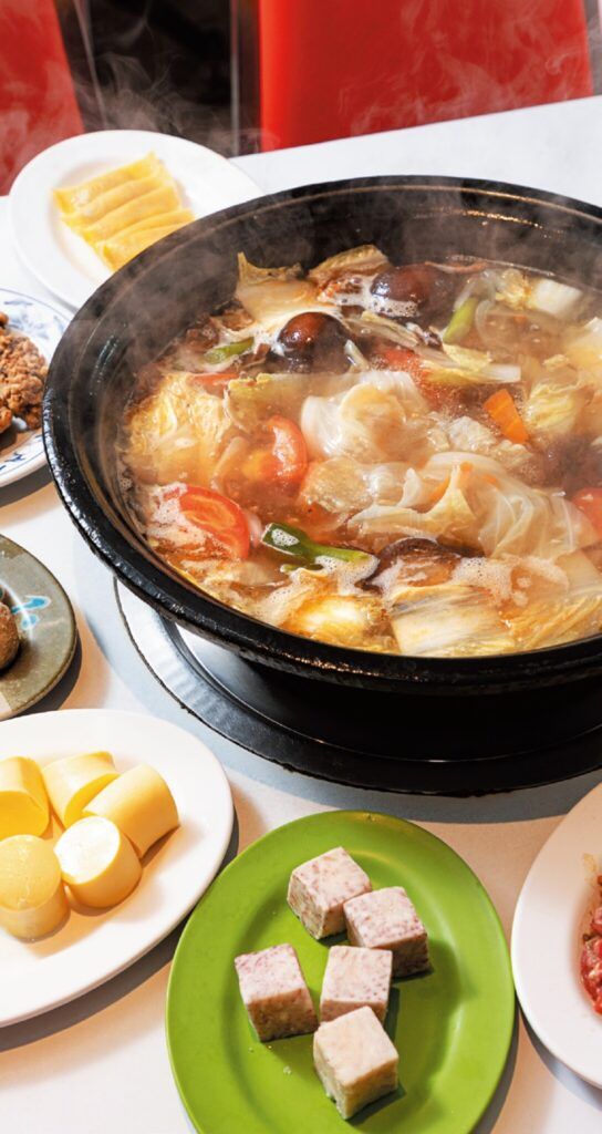 日本人には“すっぱ鍋”の呼び名で知られる白菜の漬物・酸菜を煮込む鍋「酸菜白肉火鍋」。不動の人気を誇る名店がこちら。煙突のある特徴的な鍋は、内部に炭火を入れて加熱。スープには、酸菜、しみ豆腐、豚バラ肉、カニ、牡蠣、椎茸、干しエビが入れられ、小鍋は720元。ダシの旨みで、タレなしでも十分に美味。自慢の酸菜はビタミンCと乳酸菌が豊富で美容にも良いうえ、発酵による酸味の効果で、煮込んだ具材の口当たりはあっさり、いくらでもいけてしまう。2人以上から頼めるデザートつきのランチコースは1人520元。TEL:02・2731・3439 11:30~14:00、17:30~21:30 無休 カード可、日本語メニューあり、日本語可、サービス料10%。