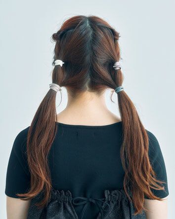 最後は耳の下で1束に結び、ゴムにワイヤーを巻きつけて完成。3段の結び目を左右対称につくるよう意識して。