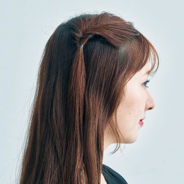 全体をセンター分けにして、 左右ともハチの位置で結んでくるりんぱにする。やや後ろめにつくるとバランス◎。