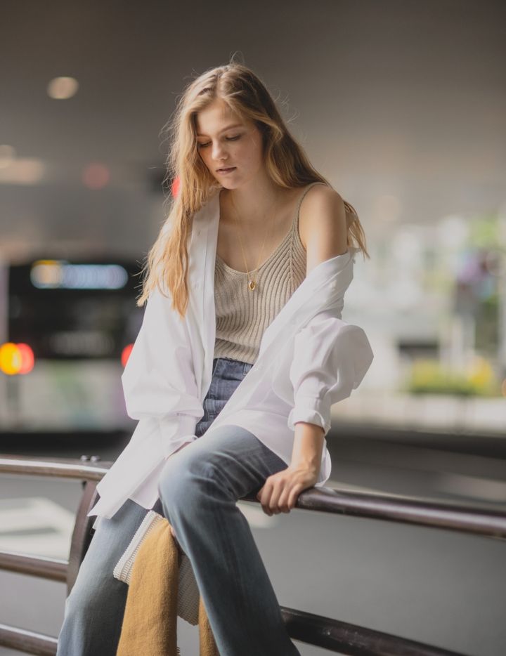 ルーズな白シャツがもたらす肌感との相乗効果