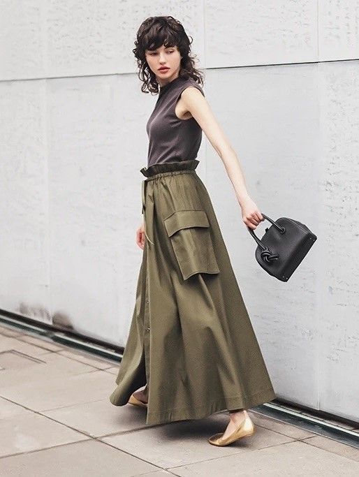 重みのあるスカート+タイトなトップスの鉄板バランス。上半身で重みを出せないぶん、ボトムにボリュームを求めたくなる真夏の装い。コンパクトなタンクトップを味方に「思いっきり長い丈のハイウエスト」を選び、ぺたんこ靴でもスタイル良く。