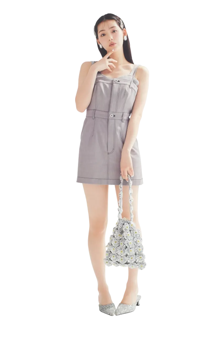 ワンピは着回し。グレーニットビスチエ 5,990円/GYDA ルミネエスト新宿店 ヘアピン 各880円/I AM THE 1(レイジーワークス) イヤリング 7,020円/アビステ バッグ 14,300円/ヘイ!ミセスローズ( キャセリーニ ) ミュール 14,300円/LA BELLE ETUDE(アンティローザ)