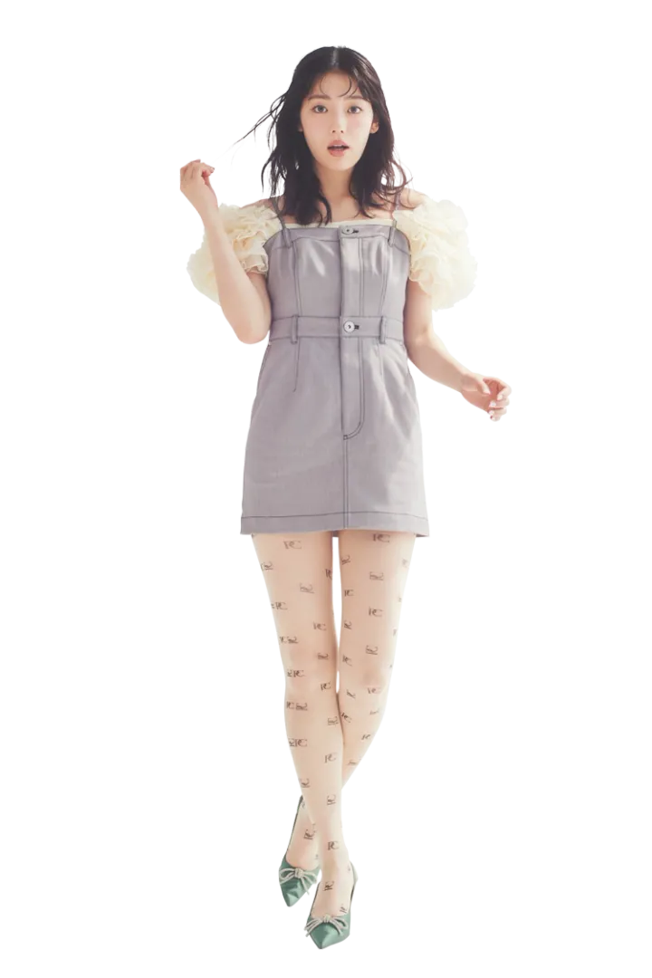 ワンピは着回し。白フリルバルーンショルダーニットトップス 18,150円/eimy istoire ルミネエスト新宿店 ロゴ入り白タイツ 4,400円/PELLICULE グリーンビジューリボンつきパンプス 8,910円/RANDA