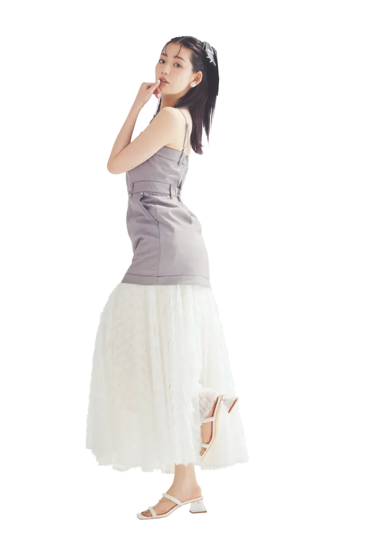 スカートにONしてロングワンピに激変♡ タイトワンピとふんわりチュールのギャップが◎。