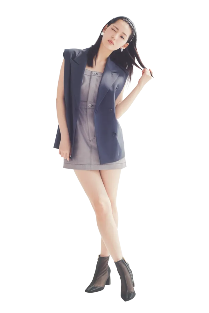 ワンピは着回し。グレーバックベルトベスト 14,300円/COCO DEAL(ココ ディール) カチューシャ 7,700円/Chapeau d' O東急プラザ銀座店 ピアス 2,160円/アビステ 黒シアーブーツ 12,980円/RANDA
