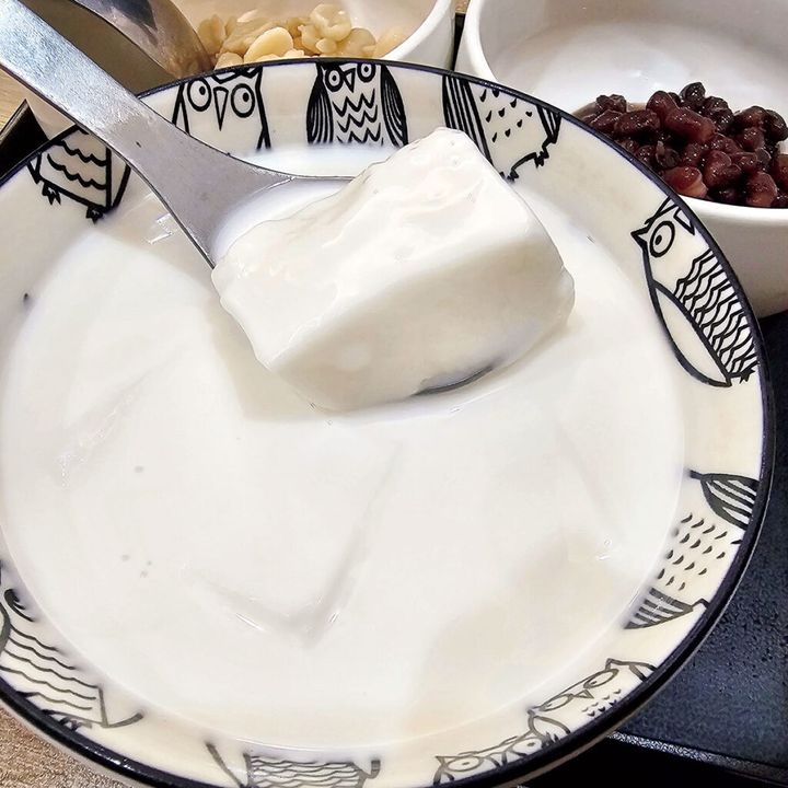 かき氷やお汁粉など、様々なスイーツを扱う店だが、なかでも高い人気を誇るのが杏仁豆腐。ここでは原料の杏仁(きょうにん)をすり潰すところから始め、タピオカの原料である樹薯粉(キャッサバの粉)を加え、約40分間、間断なくかき混ぜ続けている。こうして出来上がった杏仁豆腐は想像以上に弾力性があり、レンゲで掬い上げるだけでもプルプル食感なのがわかる。一口食べてみれば、もちっとしながらも溶けていくような食感に虜になるはず。しかも濃厚な杏仁スープに入っているのも嬉しい。そのままでも十分なおいしさだが、ホクホクとした食感の小豆か、煮込んだピーナッツをトッピングするのもおすすめ。サイズが大きめの杏仁豆腐なので、口いっぱいに頬張る幸せを噛みしめたい。