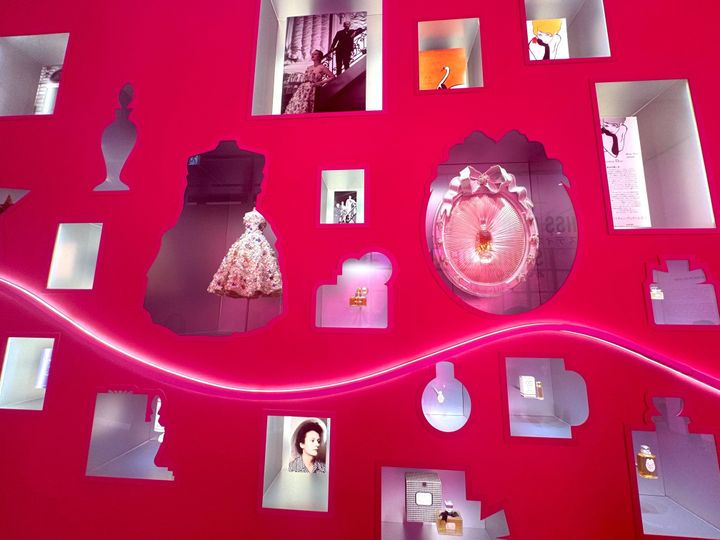 続いて、当時の写真やワードローブ、スケッチ、香水とともに、「ミス ディオール」の歴史を感じられる展示が続きます。